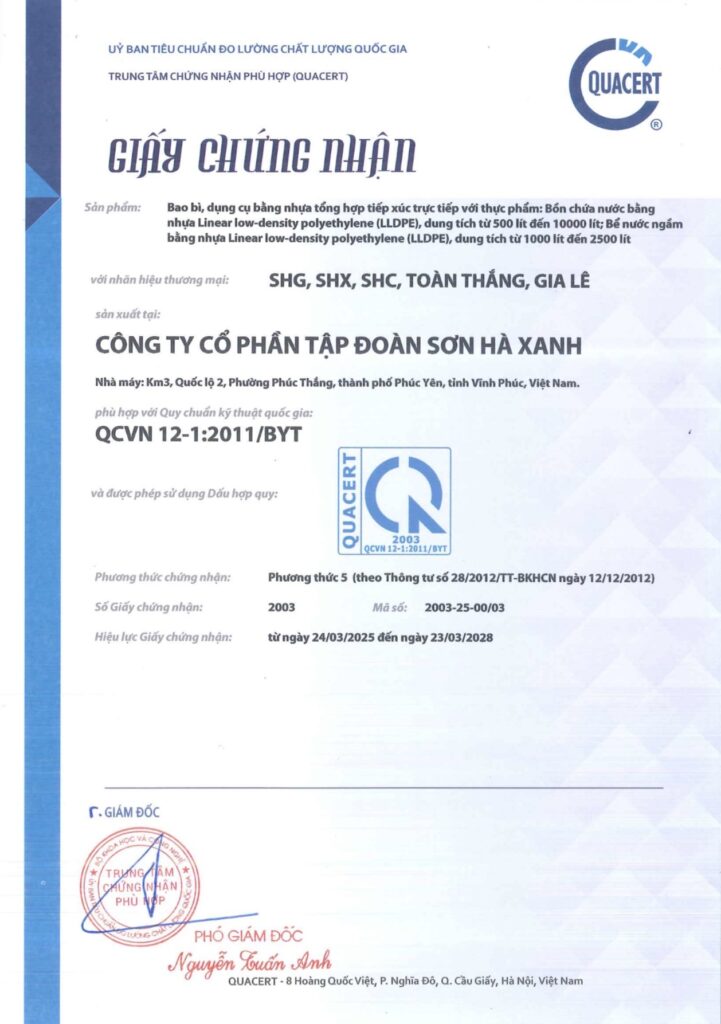 Bể nước ngầm nhựa SHG đã được chứng nhận an toàn theo QCVN 12-1:2011/BYT, đảm bảo phù hợp sử dụng cho nước sinh hoạt, giúp khách hàng hoàn toàn yên tâm trong quá trình sử dụng lâu dài.